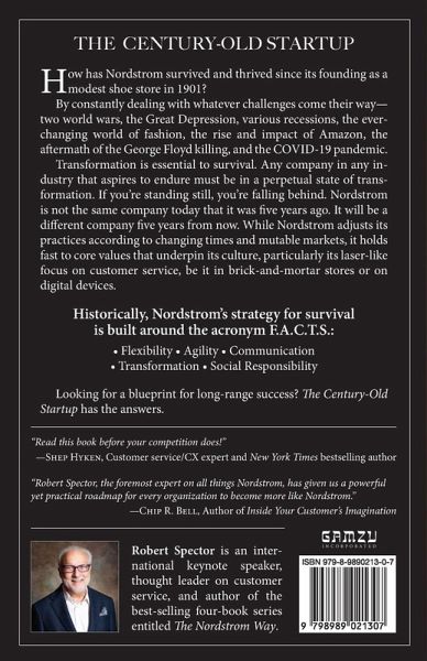 How has Nordstrom survived and thrived since its founding as a modest shoe store in 1901? By constantly dealing with whatever challenges come their way- two world wars, the Great Depression, various recessions, the everchanging world of fashion, the rise and impact of Amazon, the aftermath of the George Floyd killing, and the COVID-19 pandemic. Transformation is essential to survival. Any company in any industry that aspires to endure must be in a perpetual state of transformation. If you're standing still, you're falling behind. Nordstrom is not the same company today that it was five years ago. It will be a different company five years from now. While Nordstrom adjusts its practices according to changing times and mutable markets, it holds fast to core values that underpin its culture, particularly its laser-like focus on customer service, be it in brick-and-mortar stores or on digital devices. Historically, Nordstrom's strategy for survival is built around the acronym F.A.C.T.S.: ¿ Flexibility ¿ Agility ¿ Communication ¿ Transformation ¿ Social Responsibility Looking for a blueprint for long-range success? The Century-Old Startup has the answers.