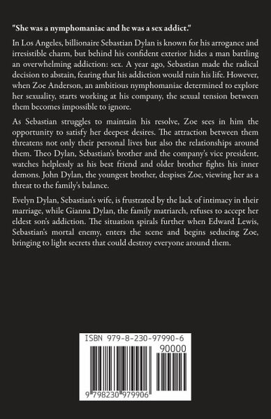 "She was a nymphomaniac and he was a sex addict." In Los Angeles, billionaire Sebastian Dylan is known for his arrogance and irresistible charm, but behind his confident exterior hides a man battling an overwhelming addiction: sex. A year ago, Sebastian made the radical decision to abstain, fearing that his addiction would ruin his life. However, when Zoe Anderson, an ambitious nymphomaniac determined to explore her sexuality, starts working at his company, the sexual tension between them becomes impossible to ignore. As Sebastian struggles to maintain his resolve, Zoe sees in him the opportunity to satisfy her deepest desires. The attraction between them threatens not only their personal lives but also the relationships around them. Theo Dylan, Sebastian's brother and the company's vice president, watches helplessly as his best friend and older brother fights his inner demons. John Dylan, the youngest brother, despises Zoe, viewing her as a threat to the family's balance. Evelyn Dylan, Sebastian's wife, is frustrated by the lack of intimacy in their marriage, while Gianna Dylan, the family matriarch, refuses to accept her eldest son's addiction. The situation spirals further when Edward Lewis, Sebastian's mortal enemy, enters the scene and begins seducing Zoe, bringing to light secrets that could destroy everyone around them.