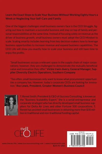 T. Renee Smith is an award-winning entrepreneur who is passionate about supporting small business owners and high-level management for top-down business success. The CEO Life was created when Smith decided to write from her own experience of finding herself stretched to breaking-point, instead of living the high-life like all the other CEO "gurus" filling the bookshelves. She is President and CEO of iSuccess Consulting Inc. and has 25 years of experience in corporate strategy, business management and leadership development. Known as the "Business Scalability Expert", Smith has assisted small businesses in obtaining more than $30 million in traditional and non-traditional funding capital. Having found her own work-life harmony, Smith enjoys reading, working out, cooking, and spending time with her husband and three children.