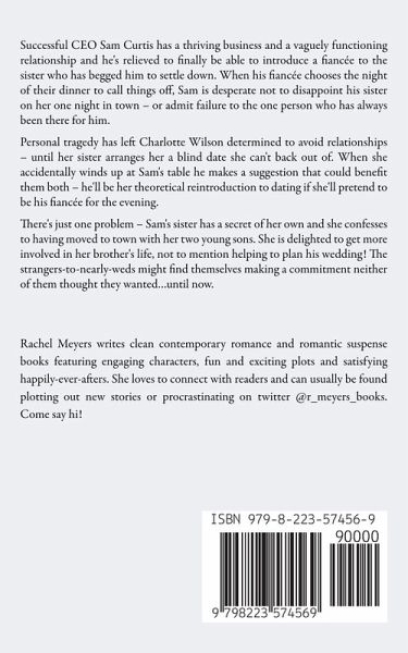 Blind-date turned fake-fiance... Successful CEO Sam Curtis has a thriving business and a vaguely functioning relationship and he's relieved to finally be able to introduce a fiancée to the sister who has begged him to settle down. When his fiancée chooses the night of their dinner to call things off, Sam is desperate not to disappoint his sister on her one night in town - or admit failure to the one person who has always been there for him. Personal tragedy has left Charlotte Wilson determined to avoid relationships - until her sister arranges her a blind date she can't back out of. When she accidentally winds up at Sam's table he makes a suggestion that could benefit them both - he'll be her theoretical reintroduction to dating if she'll pretend to be his fiancée for the evening. There's just one problem - Sam's sister has a secret of her own and she confesses to having moved to town with her two young sons. She is delighted to get more involved in her brother's life, not to mention helping to plan his wedding! The strangers-to-nearly-weds might find themselves making a commitment neither of them thought they wanted…until now.