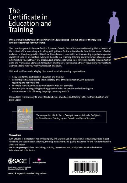 This is the core textbook for the Certificate in Education and Training. This complete guide to the Certificate, from Learning Matters, covers all the content of the mandatory units in a reader-friendly and accessible way. The text develops the reader s practical teaching skills and, through complete coverage of the content of the qualification prepares learners to teach in a wide variety of contexts. In all chapters real life examples illustrate what the theory means in practice and a reference list gives further resources to help learners with their research and study. Relevant for all learners and all awarding organisations. The book also includes information regarding teaching practice observations and the minimum core.