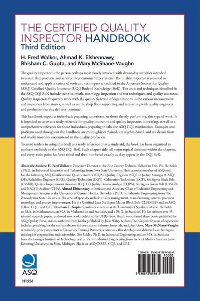The quality inspector is the person perhaps most closely involved with day-to-day activities intended to ensure that products and services meet customer expectations. The quality inspector is required to understand and apply a variety of tools and techniques as codified in the American Society for Quality (ASQ) Certified Quality Inspector (CQI) Body of Knowledge (BoK). The tools and techniques identified in the ASQ CQI BoK include technical math, metrology, inspection and test techniques, and quality assurance. Quality inspectors frequently work with the quality function of organizations in the various measurement and inspection laboratories, as well as on the shop floor supporting and interacting with quality engineers and production/service delivery personnel. This handbook supports individuals preparing to perform, or those already performing, this type of work. It is intended to serve as a ready reference for quality inspectors and quality inspectors in training, as well as a comprehensive reference for those individuals preparing to take the ASQ CQI examination. Examples and problems used throughout the handbook are thoroughly explained, are algebra-based, and are drawn from real-world situations encountered in the quality profession. To assist readers in using this book as a ready reference or as a study aid, the book has been organized to conform explicitly to the ASQ CQI BoK. Each chapter title, all major topical divisions within the chapters, and every main point has been titled and then numbered exactly as they appear in the CQI BoK.