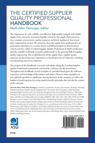 The importance of a safe, reliable, cost-effective, high-quality, integral, and nimble supply chain cannot be overstated. Equally critical are the supply chain processes (e.g., strategic, procurement, quality assurance, technical, regulatory) that ensure these requirements are met. By extension, then, the supply chain professional is of paramount importance as a creator, driver, and full participant in these business-critical activities. ASQ's Certified Supplier Quality Professional (CSQP) certification provides valuable credentials to quality professionals in the growing field of supplier quality engineering. Due to globalization of the supply chain, supplier quality engineers are becoming more important in a broad spectrum of industries, including manufacturing and service industries. The purpose of this handbook is to assist individuals taking the Certified Supplier Quality Professional examination and provide a reference for the practitioner. Throughout this handbook, several examples are provided based upon the collective experience and knowledge of the authors and editor. However, these examples are not explicitly specified in regulations, leaving decisions to the company, as well as the burden of justifying practices using sound scientific principles that provide the context of the rationale.
