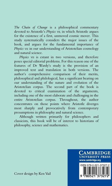 The Chain of Change, first published in 1990, is a philosophical commentary devoted to Aristotle's Physics VII, in which Aristotle argues for the existence of a first, unmoved cosmic mover. This study systematically considers the major issues of the book, and argues for the fundamental importance of Physics VII in our understanding of Aristotelian cosmology and natural science. Physics VII is extant in two versions, and therefore poses special editorial problems. For this reason one of the features of Dr Wardy's study is the provision of an improved text and translation in both versions. The author's comprehensive comparison of their merits, philosophical and philological, has a significant bearing on our understanding of the nature and evolution of the Aristotelian corpus. The second part of the book is devoted to critical examination of the argument, including one of the most elaborate and challenging in the entire Aristotelian corpus.