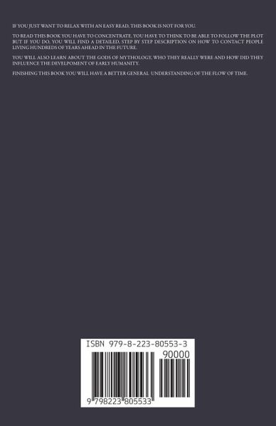 IF YOU JUST WANT TO RELAX WITH AN EASY READ, THIS BOOK IS NOT FOR YOU. TO READ THIS BOOK YOU HAVE TO CONCENTRATE. YOU HAVE TO THINK TO BE ABLE TO FOLLOW THE PLOT BUT IF YOU DO, YOU WILL FIND A DETAILED, STEP BY STEP DESCRIPTION ON HOW TO CONTACT PEOPLE LIVING HUNDREDS OF YEARS AHEAD IN THE FUTURE. YOU WILL ALSO LEARN ABOUT THE GODS OF MYTHOLOGY, WHO THEY REALLY WERE AND HOW THEY INFLUENCE THE DEVELPOMENT OF EARLY HUMANITY. FINISHING THIS BOOK YOU WILL HAVE A BETTER GENERAL UNDERSTANDING OF THE FLOW OF TIME.