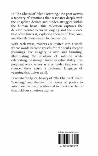 In "The Chains of Silent Yearning," the poet weaves a tapestry of emotions that resonates deeply with the unspoken desires and hidden struggles within the human heart. This collection captures the delicate balance between longing and the silence that often binds it, exploring themes of love, loss, and the relentless search for connection. With each verse, readers are invited into a world where words become vessels for the soul's deepest yearnings. The imagery is vivid and haunting, illuminating the shadows of solitude while celebrating the strength found in vulnerability. This poignant work serves as a reminder that even in silence, there exists a profound language of yearning that unites us all. Dive into the lyrical beauty of "The Chains of Silent Yearning," and discover the power of poetry to articulate the inexpressible and to break the chains that hold our emotions captive.