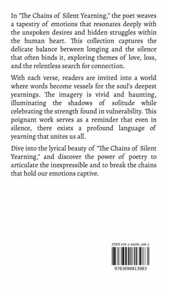 In "The Chains of Silent Yearning," the poet weaves a tapestry of emotions that resonates deeply with the unspoken desires and hidden struggles within the human heart. This collection captures the delicate balance between longing and the silence that often binds it, exploring themes of love, loss, and the relentless search for connection. With each verse, readers are invited into a world where words become vessels for the soul's deepest yearnings. The imagery is vivid and haunting, illuminating the shadows of solitude while celebrating the strength found in vulnerability. This poignant work serves as a reminder that even in silence, there exists a profound language of yearning that unites us all. Dive into the lyrical beauty of "The Chains of Silent Yearning," and discover the power of poetry to articulate the inexpressible and to break the chains that hold our emotions captive.
