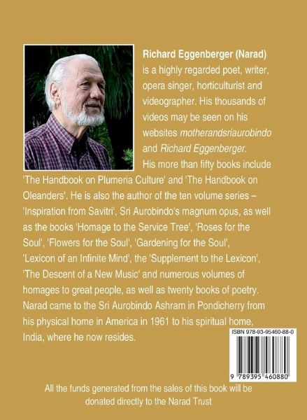 Richard Eggenberger (Narad) is a highly regarded poet, writer, opera singer, horticulturist and videographer. His thousands of videos may be seen on his websites mother and sriaurobindo and Richard Eggenberger. His more than fifty books include 'The Handbook on Plumeria Culture' and 'The Handbook on Oleanders'. He is also the author of the ten volume series - 'Inspiration from Savitri', Sri Aurobindo's magnum opus, as well as the books 'Homage to the Service Tree', 'Roses for the Soul', 'Flowers for the Soul', 'Gardening for the Soul', 'Lexicon of an Infinite Mind', the 'Supplement to the Lexicon', 'The Descent of a New Music' and numerous volumes of homages to great people, as well as twenty books of poetry. Narad came to the Sri Aurobindo Ashram in Pondicherry from his physical home in America in 1961 to his spiritual home, India, where he now resides.