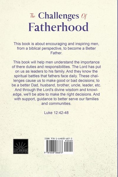 This book is about encouraging and inspiring men, from a biblical perspective, to become a Better Father. This book will help men understand the importance of there duties and responsibilities. The Lord has put on us as leaders to his family. And they know the spiritual battles that fathers face daily. These challenges cause us to make good or bad decisions; to be a better Dad, husband, brother, uncle, leader, etc. And through the Lord's divine wisdom and knowledge, we'll be able to make the right decisions. And with support, guidance to better serve our families and communities. Luke 12:42-48