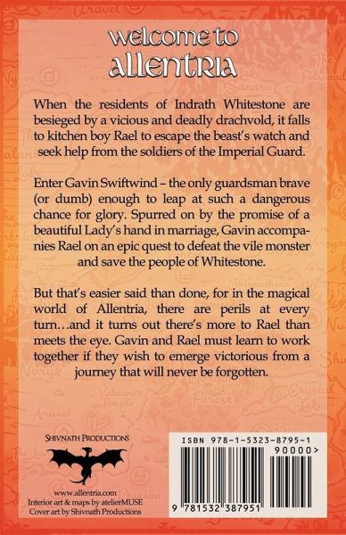 When the residents of Indrath Whitestone are besieged by a vicious and deadly drachvold, it falls to kitchen boy Rael to escape the beast's watch and seek help from the soldiers of the Imperial Guard. Enter Gavin Swiftwind - the only guardsman brave (or dumb) enough to leap at such a dangerous chance for glory. Spurred on by the promise of a beautiful Lady's hand in marriage, Gavin accompanies Rael on an epic quest to defeat the vile monster and save the people of Whitestone. But that's easier said than done, for in the magical world of Allentria, there are perils at every turn…and it turns out there's more to Rael than meets the eye. Gavin and Rael must learn to work together if they wish to emerge victorious from a journey that will never be forgotten.