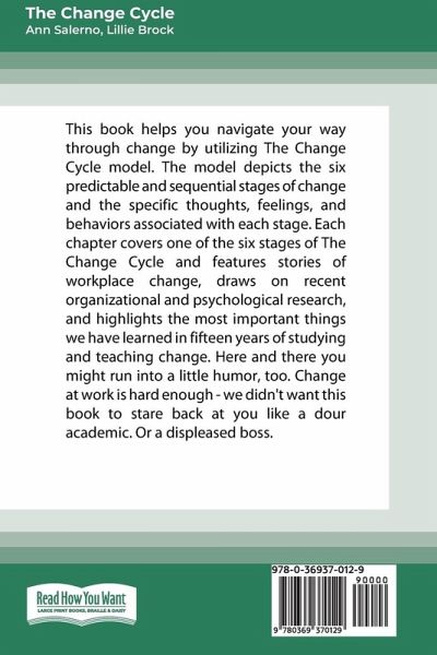 This book helps you navigate your way through change by utilizing The Change Cycle model. The model depicts the six predictable and sequential stages of change and the specific thoughts, feelings, and behaviors associated with each stage. Each chapter covers one of the six stages of The Change Cycle and features stories of workplace change, draws on recent organizational and psychological research, and highlights the most important things we have learned in fifteen years of studying and teaching change. Here and there you might run into a little humor, too. Change at work is hard enough - we didn't want this book to stare back at you like a dour academic. Or a displeased boss. The Change Cycle has been road tested by people in companies and organizations across America and on four continents. It has been used by people contemplating a career change, by the self-employed, by the recently promoted, and by the recently laid off. The model works for people up and down an organization and that is how we wrote the book: it is meant for anyone who works, manages, supervises, or leads.