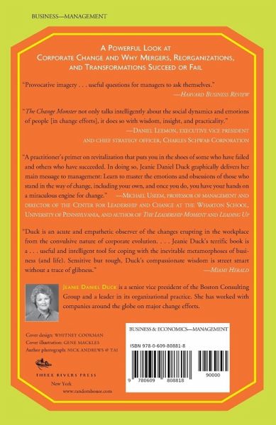 A Powerful Look at Corporate Change and Why Mergers, Reorganizations, and Transformations Succeed or Fail "[One of the] best business books of 2001 . . . [a] useful and intelligent tool for coping with the inevitable metamorphoses of business (and life).” —Miami Herald "Provocative imagery . . . useful questions for managers to ask themselves.” —Harvard Business Review "The Change Monster not only talks intelligently about the social dynamics and emotions of people [in change efforts], it does so with wisdom, insight, and practicality.”—Daniel Leemon, executive vice president and chief strategy officer, Charles Schwab Corporation "A practitioner's primer on revitalization that puts you in the shoes of some who have failed and others who have succeeded. In doing so, Jeanie Daniel Duck graphically delivers her main message to management: Learn to master the emotions and obsessions of those who stand in the way of change, including your own, and once you do, you have your hands on a miraculous engine for change.” —Michael Useem, professor of management and director of the Center for Leadership and Change at the Wharton School, University of Pennsylvania, and author of The Leadership Moment and Leading Up "Duck is an acute and empathetic observer of the changes erupting in the workplace from the convulsive nature of corporate evolution. . . . Jeanie Duck's terrific book is a . . . useful and intelligent tool for coping with the inevitable metamorphoses of business (and life). Sensitive but tough, Duck's compassionate wisdom is street smart without a trace of glibness.” —Miami Herald