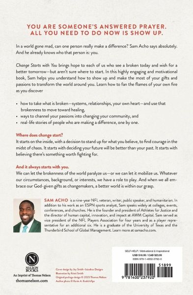 Injustice, division, and suffering may loom large in this broken world, but you have the power to stand up for truth, unity, and healing. Join writer, motivational speaker, humanitarian, and NFL veteran Sam Acho as he gives you the courage you need to be a changemaker. When gold is put into a crucible over a fire, the impurities (known as "dross") rise to the top. When faced with extreme heat, these precious metals are purified. Nothing about the metal's essential makeup changes, but the impurities in them are brought to the surface, leaving behind precious gold. America is in a crucible right now--and maybe you are, too. The pandemic has strained an already struggling economy, longstanding cultural and political divisions have reached a boiling point, and injustices have been brought into the spotlight in ways that we can no longer ignore. But the thing about crucibles is that they bring out both the worst and the best of us. As you read Change Starts with You, you'll be: Inspired to discover and follow your fire--the unique passions that God has put in each of our hearts Equipped to dream big, channeling your passions into creating positive change wherever God has called you Encouraged by Acho's firsthand accounts of communities transformed by people with the courage and tenacity to follow their own fire Motivated to be a leader who empowers others to become changemakers too Praise for Change Starts with You: "Sam is a refreshing voice that the world so needs right now. This book is not a 'how to, ' but a 'to do.' Sam is the spark to refire and refuel you like only Sam can, to become a force for good and live the unlimited life we've imagined in both a relatable and aspirational way. I can't wait for him to inspire you to take action in the same way he's inspired me." --Molly Qerim, philanthropist and host of First Take on ESPN
