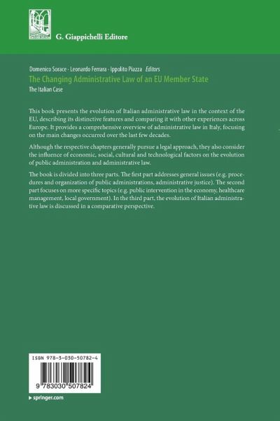 This book presents the evolution of Italian administrative law in the context of the EU, describing its distinctive features and comparing it with other experiences across Europe. It provides a comprehensive overview of administrative law in Italy, focusing on the main changes occurred over the last few decades.Although the respective chapters generally pursue a legal approach, they also consider the influence of economic, social, cultural and technological factors on the evolution of public administration and administrative law.The book is divided into three parts. The first part addresses general issues (e.g. procedures and organization of public administrations, administrative justice). The second part focuses on more specific topics (e.g. public intervention in the economy, healthcare management, local government). In the third part, the evolution of Italian administrative law is discussed in a comparative perspective.