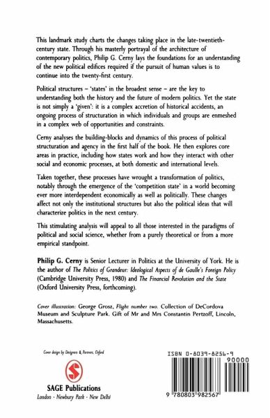 This original analysis of structuration, agency and the state offers an incisive explanation of the changing nature of the state. Cerny argues that the state is not being transcended; the architecture of politics is not moving beyond the nation-state despite the emergence of transnational structures. He points to the movement of many states towards the model of the `competition state', and away from the model of `welfare state', as the major contemporary change in the role of the state. He asserts that new forms of political action will have to evolve if the state itself is to be controlled and used for the pursuit of deeper human values in the 21st century.