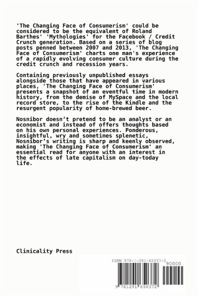 'The Changing Face of Consumerism' could be considered to be the equivalent of Roland Barthes' 'Mythologies' for the Facebook / Credit Crunch generation. Based on a series of blog posts penned between 2007 and 2013, 'The Changing Face of Consumerism' charts one man's experience of a rapidly evolving consumer culture during the credit crunch and recession years. The Changing Face of Consumerism presents a snapshot of an eventful time in modern history, from the demise of MySpace and the local record store, to the rise of the Kindle and the resurgent popularity of home-brewed beer. Ponderous, insightful, wry and sometimes splenetic, Nosnibor's writing is sharp and keenly observed, making The Changing Face of Consumerism an essential read for anyone with an interest in the effects of late capitalism on day-today life.