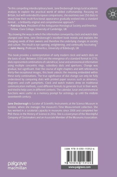 This book provides a reinterpretation of early modern clock and watch dials on the basis of use. Between 1550 and the emergence of a standard format in 1770, dials represented combinations of calendrical, lunar and astronomical information using multiple concentric rings, subsidiary dials and apertures. Change was gradual, but significant. Over the course of eight chapters and with reference to thirty-five exceptional images, this book unlocks the meaning embedded within these early combinations. The true significance of dial change can only be fully understood by comparing dials with printed paper sources such as almanacs, diagrams and craft pamphlets. Clock and watch makers drew on traditional communication methods, utilised different formats to generate trust in their work, and tried to be help users in different contexts. The calendar, lunar and astronomical functions were useful as a memory prompt for astrology up until the mid-late seventeenth century. After the decline ofthis practice, the three functions continued to be useful for other purposes, but eventually declined.