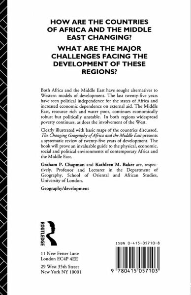 CROSS REF DEV STUDIES Both Africa and the Middle East have sought alternatives to Western models of development. The last twenty-five years have seen political independence for the states of Africa and increased economic dependence on external aid. The Middle East, resource rich and water poor, continues economically robust but politically unstable. In both regions, widespread poverty continues as does the involvement of the West. Clearly illustrated with basic maps of the countries discussed, The Changing Geography of Africa and the Middle East presents a systematic review of twenty-five years of development. The book will prove an invaluable guide to the physical, economic, social and political environments of contemporary Africa and the Middle East.