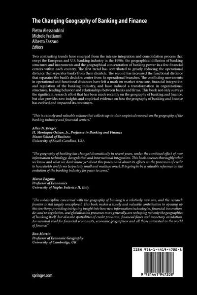Distance and Banks' Organization.- The Changing Geography of Banking and Finance: The Main Issues.- Financial Innovation, Organizations, and Small Business Lending.- Does Distance Matter in Banking?.- Distance, Bank Organizational Structure, and Lending Decisions.- Geographical Organization of Banking Systems and Innovation Diffusion.- Distance and Internet Banking.- Borders and Market Structure.- Bank Market Structure, Competition, and Stability: Issues and Concepts.- Bank Cross-Border Mergers and Acquisitions: Causes, Consequences, and Recent Trends.- What Are Borders Made of? An Analysis of Barriers to European Banking Integration.- Regulatory Framework and Financial Centers.- Designing a Regulatory and Supervisory Framework for Integrated Financial Markets.- Crisis Management and Lender of Last Resort in the European Banking Market.- The Evolutionary Chain of International Financial Centers.- Financial Centers Between Centralization and Virtualization.