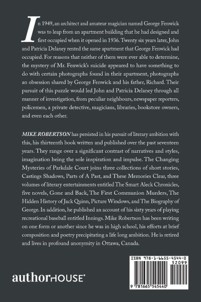 Mike Robertson has persisted in his pursuit of literary ambition with this, his thirteenth book written and published over the past seventeen years. They range over a significant contrast of narratives and styles, imagination being the sole inspiration and impulse. The Changing Mysteries of Parkdale Court joins three collections of short stories, Castings Shadows, Parts of A Past, and These Memories Clear, three volumes of literary entertainments entitled The Smart Aleck Chronicles, five novels, Gone and Back, The First Communion Murders, The Hidden History of Jack Quinn, Picture Windows, and The Biography of George. In addition, he published an account of his sixty years of playing recreational baseball entitled Innings. Mike Robertson has been writing on one form or another since he was in high school, his efforts at brief composition and poetry precipitating a life long ambition. He is retired and lived in profound anonymity in Ottawa, Canada.