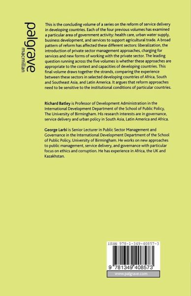 RICHARD BATLEY is Professor in the International Development Department of the School of Public Policy at the University of Birmingham, UK. His research interests are in governance, service delivery and urban policy in India, Latin America and Africa. GEORGE LARBI is Senior Lecturer in Public Sector Management and Governance in the International Development Department at the University of Birmingham, UK. He works on new approaches to public management, service delivery and governance. He has experience in Africa, the UK and Kazakhstan. He is Assistant Editor of the journal Public Administration and Development.