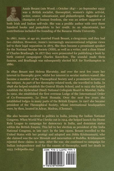 Annie Besant (née Wood; 1 October 1847 - 20 September 1933) was a British socialist, theosophist, women's rights activist, writer, orator, educationist, and philanthropist. Regarded as a champion of human freedom, she was an ardent supporter of both Irish and Indian self-rule. She was a prolific author with over three hundred books and pamphlets to her credit. As an educationist, her contributions included the founding of the Banaras Hindu University. In 1867, Annie, at age 20, married Frank Besant, a clergyman, and they had two children. However, Annie's increasingly unconventional religious views led to their legal separation in 1873. She then became a prominent speaker for the National Secular Society (NSS), as well as a writer, and a close friend of Charles Bradlaugh. In 1877 they were prosecuted for publishing a book by birth control campaigner Charles Knowlton. The scandal made them famous, and Bradlaugh was subsequently elected M.P. for Northampton in 1880. In 1890 Besant met Helena Blavatsky, and over the next few years her interest in theosophy grew, whilst her interest in secular matters waned. She became a member of the Theosophical Society and a prominent lecturer on the subject. As part of her theosophy-related work, she travelled to India. In 1898 she helped establish the Central Hindu School, and in 1922 she helped establish the Hyderabad (Sind) National Collegiate Board in Mumbai, India. In 1902, she established the first overseas Lodge of the International Order of Co-Freemasonry, Le Droit Humain. Over the next few years she established lodges in many parts of the British Empire. In 1907 she became president of the Theosophical Society, whose international headquarters were, by then, located in Adyar, Madras, (Chennai). She also became involved in politics in India, joining the Indian National Congress. When World War I broke out in 1914, she helped launch the Home Rule League to campaign for democracy in India, and dominion status within the British Empire. This led to her election as president of the India National Congress, in late 1917. In the late 1920s, Besant travelled to the United States with her protégé and adopted son Jiddu Krishnamurti, who she claimed was the new Messiah and incarnation of Buddha. Krishnamurti rejected these claims in 1929. After the war, she continued to campaign for Indian independence and for the causes of theosophy, until her death in 1933. (wikipedia.org)