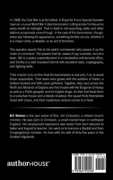 In 1968, the Cold War is at its hottest. A Royal Air Force Special Operator hears an unusual World War II style transmission cutting across his frequency every month at midnight. That in itself is not surprising; static and other stations occasionally come through. In the case of this transmission, though, every day following its appearance, something terrible occurs, whether it is a major crime, a disaster, or an act of terrorism. The operator reports this to his watch commander who passes it up the chain of command. The powers that be, aware of spy scandals, recruit a team. Bill is a police superintendent in a clandestine anti-terrorist office, and Smithy is a wild moorland hermit with excellent radio, cryptography, and fighting skills. Their mission is to confirm that the transmission is real and, if so, to arrest those responsible. Their team soon grows with the addition of Karen, a brilliant student and Bill's posh girlfriend. Together, they race across the North and Midlands of England and find trouble with the Bulgarian Embassy as well as a Polish gangster and his English thugs. As their trail leads them to a suburban house and a bloody shootout, the squad finds themselves faced with chaos, and their mysterious venture comes to a head.