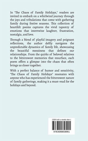 In "The Chaos of Family Holidays," readers are invited to embark on a whirlwind journey through the joys and tribulations that come with gathering family during festive seasons. This collection of heartfelt poems captures the vivid tapestry of emotions that intertwine laughter, frustration, nostalgia, and love. Through a blend of playful imagery and poignant reflections, the author deftly navigates the unpredictable dynamics of family life, showcasing the beautiful messiness that defines our relationships. From the quirks of beloved relatives to the bittersweet memories that resurface, each poem offers a glimpse into the chaos that often brings us closer together. With a perfect balance of humor and sensitivity, "The Chaos of Family Holidays" resonates with anyone who has experienced the bittersweet nature of family gatherings, making it a must-read for the holidays and beyond.