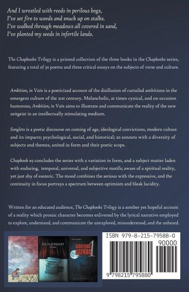 And I wrestled with reeds in perilous bogs, I've set fire to weeds and snuck up on stalks. I've walked through meadows all covered in sand, I've planted my seeds in infertile lands. The Chapbooks Trilogy is a printed collection of the three books in the Chapbooks series, featuring a total of 50 poems and three critical essays on the subjects of verse and culture. Ambition, in Vain is a poeticized account of the disillusion of curtailed ambitions in the emergent culture of the 21st century. Melancholic, at times cynical, and on occasion humorous, Ambition, in Vain aims to illustrate and communicate the reality of the new zeitgeist in an intellectually stimulating medium. Songlets is a poetic discourse on coming of age, ideological convictions, modern culture and its impacts; psychological, social, and historical; 20 sonnets with a diversity of subjects and themes, united in form and their poetic scope. Chapbook #3 concludes the series with a variation in form, and a subject matter laden with enduring, temporal, universal, and subjective motifs; aware of a spiritual reality, yet just shy of esoteric. The mood combines the serious with the expressive, and the continuity in focus portrays a spectrum between optimism and bleak lucidity. Written for an educated audience, The Chapbooks Trilogy is a somber yet hopeful account of a reality which prosaic character becomes enlivened by the lyrical narrative employed to explore, understand, and communicate the unexplored, misunderstood, and the unheard.