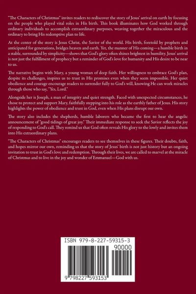 "The Characters of Christmas" invites readers to rediscover the story of Jesus' arrival on earth by focusing on the people who played vital roles in His birth. This book illuminates how God worked through ordinary individuals to accomplish extraordinary purposes, weaving together the miraculous and the ordinary to bring His redemptive plan to life. At the center of the story is Jesus Christ, the Savior of the world. His birth, foretold by prophets and anticipated for generations, bridges heaven and earth. Yet, the manner of His coming-a humble birth in a stable, surrounded by simplicity-shows that God's glory often shines brightest in humility. Jesus' arrival is not just the fulfillment of prophecy but a reminder of God's love for humanity and His desire to be near to us. The narrative begins with Mary, a young woman of deep faith. Her willingness to embrace God's plan, despite its challenges, inspires us to trust in His promises even when they seem impossible. Her quiet obedience and courage encourage readers to surrender fully to God's will, knowing He can work miracles through those who say, "Yes, Lord." Alongside her is Joseph, a man of integrity and quiet strength. Faced with unexpected circumstances, he chose to protect and support Mary, faithfully stepping into his role as the earthly father of Jesus. His story highlights the power of obedience and trust in God, even when His plans disrupt our own. The story also includes the shepherds, humble laborers who became the first to hear the angelic announcement of "good tidings of great joy." Their immediate response to seek the Savior reflects the joy of responding to God's call. They remind us that God often reveals His glory to the lowly and invites them into His extraordinary plans. The wise men, traveling from afar, symbolize the beauty of seeking Jesus no matter the cost. Guided by a star, they brought gifts of gold, frankincense, and myrrh, representing Jesus as King, Priest, and Savior. Their devotion challenges us to pursue Christ wholeheartedly, recognizing His worth above all. Even the settings of the story-Bethlehem, the manger, and the guiding star-carry profound meaning. These humble details remind us that God delights in using the overlooked and ordinary to fulfill His purposes. Every element of the Christmas story, from the angels' songs to the shepherds' joy, points to God's perfect plan and His glory in the unexpected. "The Characters of Christmas" encourages readers to see themselves in these figures. Their doubts, faith, and hopes mirror our own, reminding us that the story of Jesus' birth is not just history but an ongoing invitation to trust in God's love and redemption. Through their lives, we are called to marvel at the miracle of Christmas and to live in the joy and wonder of Emmanuel-God with us.