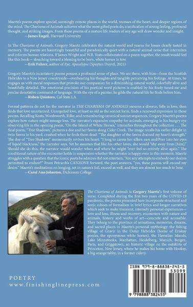 The Charisma of Animals is Gregory Maertz's first volume of verse. Completed during the first two years of the COVID-19 pandemic, the poems presented here incorporate structural and sonic echoes of formalism in brief lyrics and longer narratives which seek to make transient, intensely personal experiences-love and loss, illness and recovery, encounters with nature and animals, history and works of art-concrete and accessible. They belong to the province of sensations, memories, dreams, and sacred places in Maertz's personal mythology: the fishing village of Gravir in the Outer Hebrides (home of Eriskay ponies, the eponymous white horses), the Hawaiian Islands, Lake Minnetonka, Manhattan, Heidelberg, Munich, Bergen, Paris, and Griggstown, an historic village on the outskirts of Princeton, New Jersey, where he makes his home with Hooksy, a big orange tabby, in a former cidery.