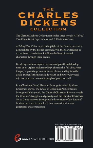 The Charles Dickens Collection includes three novels; A Tale of Two Cities, Great Expectations, and A Christmas Carol. A Tale of Two Cities, depicts the plight of the French peasantry demoralized by the French aristocracy in the years leading up to the French revolution. It follows the lives of several characters through these events. Great Expectations, depicts the personal growth and development of an orphan nicknamed Pip. The novel is full of extreme imagery - poverty; prison ships and chains, and fights to the death. Dickens's themes include wealth and poverty, love and rejection, and the eventual triumph of good over evil. In A Christmas Carol, Ebenezer Scrooge is visited by three Christmas spirits. The Ghost of Christmas Past confronts Scrooge with his youth, the Ghost of Christmas Present reveals the Cratchits' struggle amid poverty, and the Ghost of Christmas Yet to Come harrows Scrooge with dire visions of the future if he does not learn to treat his fellow man with kindness, generosity and compassion.