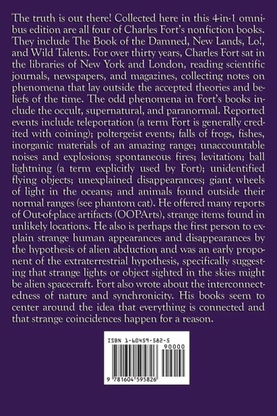 The truth is out there! Collected here in this 4-in-1 omnibus edition are all four of Charles Fort's nonfiction books. They include The Book of the Damned, New Lands, Lo!, and Wild Talents. For over thirty years, Charles Fort sat in the libraries of New York and London, reading scientific journals, newspapers, and magazines, collecting notes on phenomena that lay outside the accepted theories and beliefs of the time. The odd phenomena in Fort's books include the occult, supernatural, and paranormal. Reported events include teleportation (a term Fort is generally credited with coining); poltergeist events; falls of frogs, fishes, inorganic materials of an amazing range; unaccountable noises and explosions; spontaneous fires; levitation; ball lightning (a term explicitly used by Fort); unidentified flying objects; unexplained disappearances; giant wheels of light in the oceans; and animals found outside their normal ranges (see phantom cat). He offered many reports of Out-of-place artifacts (OOPArts), strange items found in unlikely locations. He also is perhaps the first person to explain strange human appearances and disappearances by the hypothesis of alien abduction and was an early proponent of the extraterrestrial hypothesis, specifically suggesting that strange lights or object sighted in the skies might be alien spacecraft. Fort also wrote about the interconnectedness of nature and synchronicity. His books seem to center around the idea that everything is connected and that strange coincidences happen for a reason.