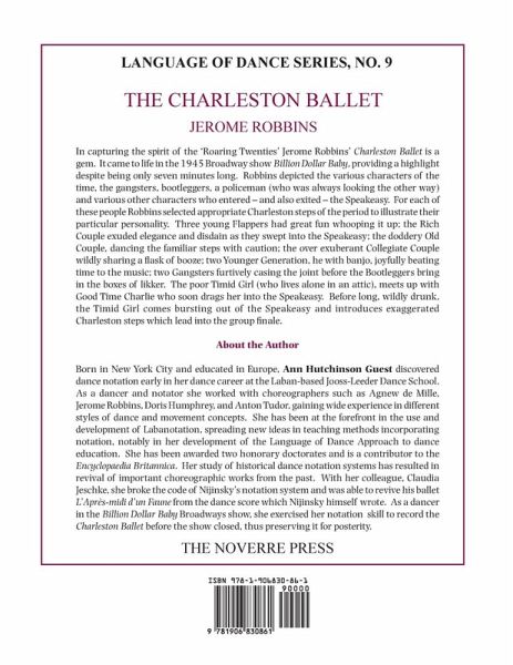 A Labanotation score. In capturing the spirit of the ‘Roaring Twenties’ Jerome Robbins’ Charleston Ballet is a gem. It came to life in the 1945 Broadway show Billion Dollar Baby, providing a highlight despite being only seven minutes long. Robbins depicted the various characters of the time, the gangsters, bootleggers, a policeman (who was always looking the other way) and various other characters who entered – and also exited – the Speakeasy. For each of these people Robbins selected appropriate Charleston steps of the period to illustrate their particular personality. Three young Flappers had great fun whooping it up; the Rich Couple exuded elegance and disdain as they swept into the Speakeasy; the doddery Old Couple, dancing the familiar steps with caution; the over exuberant Collegiate Couple wildly sharing a flask of booze; two Younger Generation, he with banjo, joyfully beating time to the music; two Gangsters furtively casing the joint before the Bootleggers bring in the boxes of likker. The poor Timid Girl (who lives alone in an attic), meets up with Good Time Charlie who soon drags her into the Speakeasy. Before long, wildly drunk, the Timid Girl comes bursting out the Speakeasy and introduces exaggerated Charleston steps which leads into the group finale.