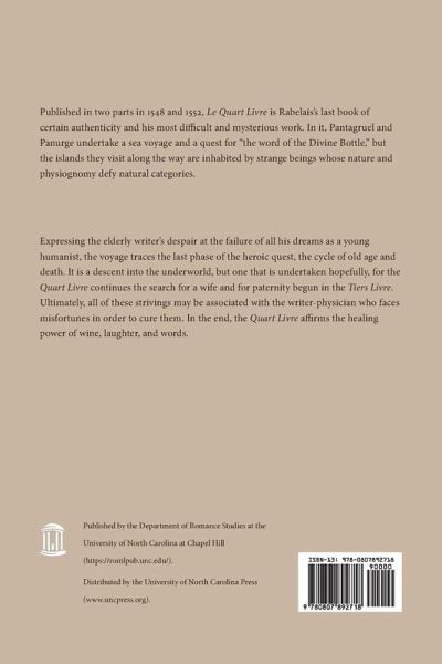Published in two parts in 1548 and 1552, "Le Quart Livre is Rabelais's last book of certain authenticity and his most difficult and mysterious work. In it, Pantagruel and Panurge undertake a sea voyage and a quest for "the word of the Divine Bottle, " but the islands they visit along the way are inhabited by strange beings whose nature and physiognomy defy natural categories.