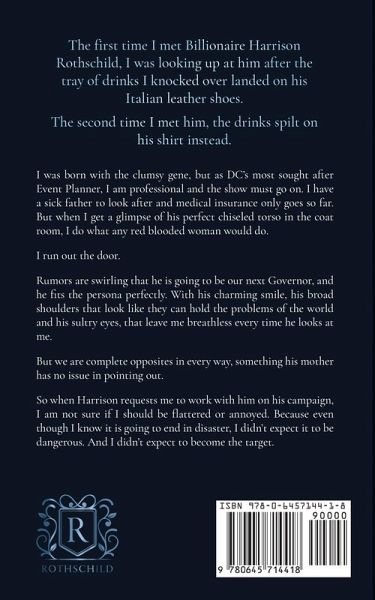 The first time I met Billionaire Harrison Rothschild, I was looking up at him after the tray of drinks I knocked over landed on his Italian leather shoes. The second time I met him, the drinks spilt on his shirt instead. I was born with the clumsy gene, but as DC's most sought after Event Planner, I am professional and the show must go on. I have a sick father to look after and medical insurance only goes so far. But when I get a glimpse of his perfect chiseled torso in the coat room, I do what any red blooded woman would do. I run out the door. Rumors are swirling that he is going to be our next Governor, and he fits the persona perfectly. With his charming smile, his broad shoulders that look like they can hold the problems of the world and his sultry eyes, that leave me breathless every time he looks at me. But we are complete opposites in every way, something his mother has no issue in pointing out. So when Harrison requests me to work with him on his campaign, I am not sure if I should be flattered or annoyed. Because even though I know it is going to end in disaster, I didn't expect it to be dangerous. And I didn't expect to become the target.