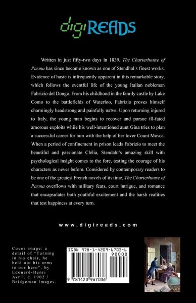 Written in just fifty-two days in 1839, "The Charterhouse of Parma" has since become known as one of Stendhal's finest works. Evidence of haste is infrequently apparent in this remarkable story, which follows the eventful life of the young Italian nobleman Fabrizio del Dongo. From his childhood in the family castle by Lake Como to the battlefields of Waterloo, Fabrizio proves himself charmingly headstrong and painfully naïve. Upon returning injured to Italy, the young man begins to recover and pursue ill-fated amorous exploits while his well-intentioned aunt Gina tries to plan a successful career for him with the help of her lover Count Mosca. When a period of confinement in prison leads Fabrizio to meet the beautiful and passionate Clélia, Stendahl's amazing skill with psychological insight comes to the fore, testing the courage of his characters as never before. Considered by contemporary readers to be one of the greatest French novels of its time, "The Charterhouse of Parma" overflows with military feats, court intrigue, and romance that encapsulates both youthful excitement and the harsh realities that test happiness at every turn. This edition is printed on premium acid-free paper.