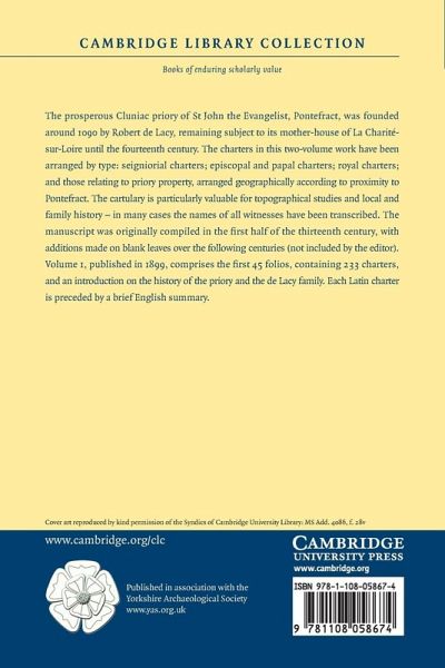 The prosperous Cluniac priory of St John the Evangelist, Pontefract, was founded around 1090 by Robert de Lacy, remaining subject to its mother-house of La Charité-sur-Loire until the fourteenth century. The charters in this two-volume work have been arranged by type: seigniorial charters; episcopal and papal charters; royal charters; and those relating to priory property, arranged geographically according to proximity to Pontefract. The chartulary is particularly valuable for topographical studies and local and family history - in many cases the names of all witnesses have been transcribed. The manuscript was originally compiled in the first half of the thirteenth century, with additions made on blank leaves over the following centuries (not included by the editor). Volume 1, published in 1899, comprises the first 45 folios, containing 233 charters, and an introduction on the history of the priory and the de Lacy family. Each Latin charter is preceded by a brief English summary.
