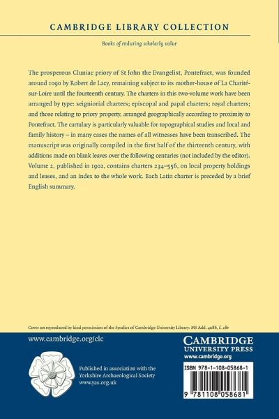 The prosperous Cluniac priory of St John the Evangelist, Pontefract, was founded around 1090 by Robert de Lacy, remaining subject to its mother-house of La Charité-sur-Loire until the fourteenth century. The charters in this two-volume work have been arranged by type: seigniorial charters; episcopal and papal charters; royal charters; and those relating to priory property, arranged geographically according to proximity to Pontefract. The chartulary is particularly valuable for topographical studies and local and family history - in many cases the names of all witnesses have been transcribed. The manuscript was originally compiled in the first half of the thirteenth century, with additions made on blank leaves over the following centuries (not included by the editor). Volume 2, published in 1902, contains charters 234-556, on local property holdings and leases, and an index to the whole work. Each Latin charter is preceded by a brief English summary.