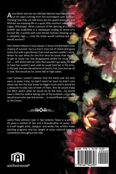 Anna Marie and her son Michael Warren have been on the run for years running from her ex-husband Liam Sullivan. Thinking that they are safe Anna lets her guard down she and Michael are enjoying life in a quiet little southern town called Logan, Mississippi. When a picture of her dancing at a charity benefit was published in a newspaper ending all sense of a normal life, it ended with Liam Declan Sullivan showing up in a complete rage........now the chase would continue but who would survivor? John Robert Mason a local lawyer is Anna and Michael's only chance of survival. He is a man's man full of charm and good looks, but with a gentleness that most women couldn't resist. When he saw Anna for the first time he knew that he had to get to know her, she disappeared before he could meet her...... left alone with an ache that wouldn't go away, he had to have her couldn't wait until he could hold her in his arms, in his bed, she was the epitome of desire, lust, love and sex all in one. She would be his come hell or high water. Liam Sullivan couldn't believe that the bitch and the brat were so damn close, he didn't want her back he didn't care about her but the brat knew to friggin much and it would be a pleasure to take care of both of them, first he would make the Bitch watch what he would do to the brat.....he would have a little fun before taking care of the problem....then she would know who was the winner.....it would finely put an end to the Chase.