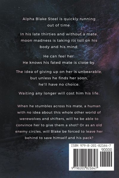 Alpha Blake Steel is running out of time. In his late thirties and without a mate, moon madness is starting to take its toll. He can feel her. He knows his fated mate is close by. The idea of giving up on her is unbearable, but unless he finds her soon, he'll have no choice. Waiting any longer will cost him his life. When he stumbles across his mate, a human with no idea about this whole new world of werewolves and shifters, will he be able to convince her to give them a shot? Or with the clock ticking, and an old enemy circling, will he be forced to leave her behind to save himself and his pack? This is a steamy, dual POV, MF paranormal romance. HEA and no cheating guaranteed.