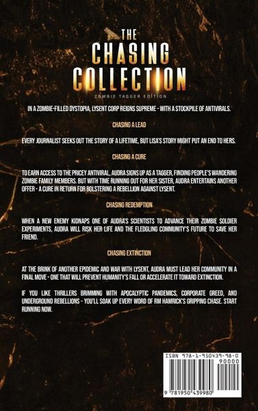 In a zombie-filled dystopia, Lysent Corp reigns supreme - with a stockpile of antivirals. Chasing a Lead Every journalist seeks out the story of a lifetime, but Lisa's story might put an end to hers. Chasing a Cure To earn access to the pricey antiviral, Audra signs up as a tagger, finding people's wandering zombie family members. But with time running out for her sister, Audra entertains another offer - a cure in return for bolstering a rebellion against Lysent. Chasing Redemption When a new enemy kidnaps one of Audra's scientists to advance their zombie soldier experiments, Audra will risk her life and the fledgling community's future to save her friend. Chasing Extinction At the brink of another epidemic and war with Lysent, Audra must lead her community in a final move - one that will prevent humanity's fall or accelerate it toward extinction. If you like thrillers brimming with apocalyptic pandemics, corporate greed, and underground rebellions - you'll soak up every word of RM Hamrick's gripping chase. Start running now.