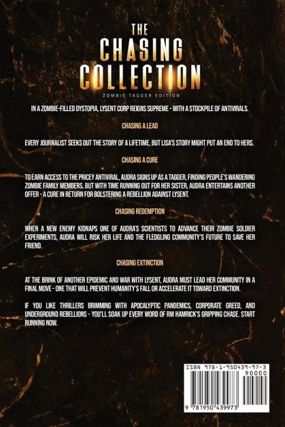 In a zombie-filled dystopia, Lysent Corp reigns supreme - with a stockpile of antivirals. Chasing a Lead Every journalist seeks out the story of a lifetime, but Lisa's story might put an end to hers. Chasing a Cure To earn access to the pricey antiviral, Audra signs up as a tagger, finding people's wandering zombie family members. But with time running out for her sister, Audra entertains another offer - a cure in return for bolstering a rebellion against Lysent. Chasing Redemption When a new enemy kidnaps one of Audra's scientists to advance their zombie soldier experiments, Audra will risk her life and the fledgling community's future to save her friend. Chasing Extinction At the brink of another epidemic and war with Lysent, Audra must lead her community in a final move - one that will prevent humanity's fall or accelerate it toward extinction. If you like thrillers brimming with apocalyptic pandemics, corporate greed, and underground rebellions - you'll soak up every word of RM Hamrick's gripping chase. Start running now.