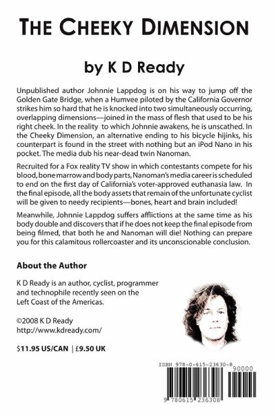 A fateful accident strands unpublished author Johnnie Lappdog in two overlapping dimensions. In one, he is grateful to be alive; in the other, he suffers from Locked-In Syndrome, or coma with consciousness. Known as Nanoman, the comatose Johnnie becomes the star of a reality TV show where his organs are harvested for needy recipients. Meanwhile, his grateful counterpart suffers each time the ailing twin donates his body assets. Discovering the cause of his affliction, Johnnie must prevent the final episode of the show from taking place, or Nanoman will be legally euthanized, killing them both! San Francisco and international locations spice up this dark comedy.