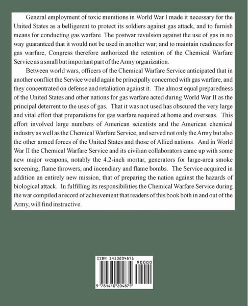 General employment of toxic munitions in World War I made it necessary for the United States as a belligerent to protect its soldiers against gas attack, and to furnish means for conducting gas warfare. The postwar revulsion against the use of gas in no way guaranteed that it would not be used in another war; and to maintain readiness for gas warfare, Congress therefore authorized the retention of the Chemical Warfare Service as a small but important part of the Army organization. Between world wars, officers of the Chemical Warfare Service anticipated that in another conflict the Service would again be principally concerned with gas warfare, and they concentrated on defense and retaliation against it. The almost equal preparedness of the United States and other nations for gas warfare acted during World War II as the principal deterrent to the uses of gas. That it was not used has obscured the very large and vital effort that preparations for gas warfare required at home and overseas. This effort involved large numbers of American scientists and the American chemical industry as well as the Chemical Warfare Service, and served not only the Army but also the other armed forces of the United States and those of Allied nations. And in World War II the Chemical Warfare Service and its civilian collaborators came up with some new major weapons, notably the 4.2-inch mortar, generators for large-area smoke screening, flame throwers, and incendiary and flame bombs. The Service acquired in addition an entirely new mission, that of preparing the nation against the hazards of biological attack. In fulfilling its responsibilities the Chemical Warfare Service during the war compiled a record of achievement that readers of this book both in and out of the Army, will find instructive.