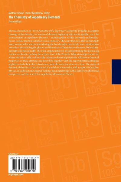 The second edition of "The Chemistry of the Superheavy Elements" provides a complete coverage of the chemistry of a series of elements beginning with atomic number 104 - the transactinides or superheavy elements - including their nuclear properties and production in nuclear reactions at heavy-ion accelerators. The contributors to this work include many renowned scientists who, during the last decades, have made vast contributions towards understanding the physics and chemistry of these elusive elements, both experimentally and theoretically. The main emphasis here is on demonstrating the fascinating studies involved in probing the architecture of the Periodic Table at its uppermost end, where relativistic effects drastically influence chemical properties. All known chemical properties of these elements are described together with the experimental techniques applied to study these short-lived man-made elements one atom-at-a-time. The status of theoretical chemistry and of empirical models is presented as well as aspects of nuclear physics. In addition, one chapter outlines the meanderings in this field from a historical perspective and the search for superheavy elements in Nature.