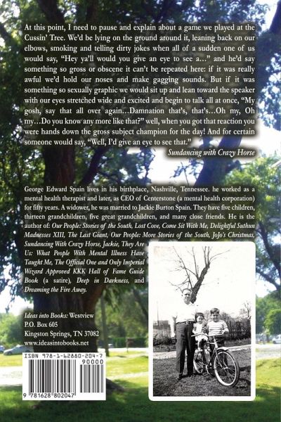 At this point, I need to pause and explain about a game we played at the Cussin' Tree. We'd be lying on the ground around it, leaning back on our elbows, smoking and telling dirty jokes when all of a sudden one of us would say, "Hey ya'll would you give an eye to see a..." and he'd say something so gross or obscene it can't be repeated here: if it was really awful we'd hold our noses and make gagging sounds. But if it was something so sexually graphic we would sit up and lean toward the speaker with our eyes stretched wide and excited and begin to talk all at once, "My gosh, say that all over again...Damnation that's, that's...Oh my, Oh my...Do you know any more like that?" well, when you got that reaction you were hands down the gross subject champion for the day! And for certain someone would say, "Well, I'd give an eye to see that."