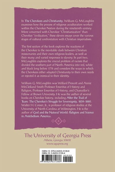 In "The Cherokees and Christianity," William G. McLoughlin examines how the process of religious acculturation worked within the Cherokee Nation during the nineteenth century. More concerned with Cherokee "Christianization" than Cherokee "civilization," these eleven essays cover the various stages of cultural confrontation with Christian imperialism. The first section of the book explores the reactions of the Cherokee to the inevitable clash between Christian missionaries and their own religious leaders, as well as their many and varied responses to slavery. In part two, McLoughlin explores the crucial problem of racism that divided the southern part of North America into red, white and black long before 1776 and considers the ways in which the Cherokees either adapted Christianity to their own needs or rejected it as inimical to their identity.