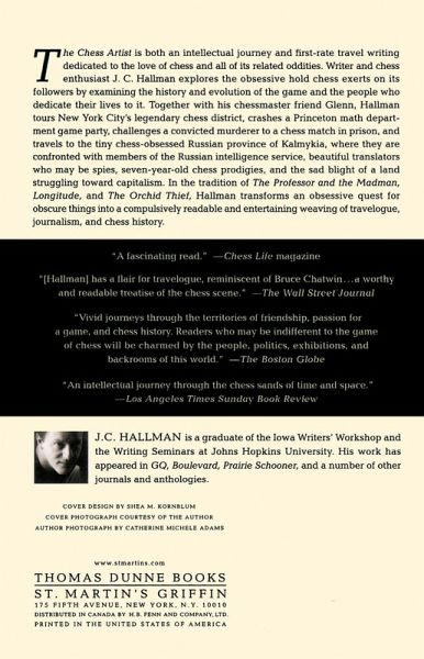 In the tradition of The Professor and the Madman, Longitude, and The Orchid Thief, Hallman transforms an obsessive quest for obscure things into a compulsively readable and entertaining weaving of travelogue, journalism, and chess history. In the tiny Russian province of Kalmykia, obsession with chess has reached new heights. Its leader, a charismatic and eccentric millionaire/ex--car salesman named Kirsan Ilyumzhinov, is a former chess prodigy and the most recent president of FIDE, the world's controlling chess body. Despite credible allegations of his involvement in drug running, embezzlement, and murder, the impoverished Kalmykian people have rallied around their leader's obsession---chess is played on Kalmykian prime-time television and is compulsory in Kalmykian schools. In addition, Kalmyk women have been known to alter their traditional costumes of pillbox hats and satin gowns to include chessboard-patterned sashes. The Chess Artist is both an intellectual journey and first-rate travel writing dedicated to the love of chess and all of its related oddities, writer and chess enthusiast J. C. Hallman explores the obsessive hold chess exerts on its followers by examining the history and evolution of the game and the people who dedicate their lives to it. Together with his friend Glenn Umstead, an African-American chessmaster who is arguably as chess obsessed as Ilyumzhinov, Hallman tours New York City's legendary chess district, crashes a Princeton Math Department game party, challenges a convicted murderer to a chess match in prison, and travels to Kalmykia, where they are confronted with members of the Russian intelligence service, beautiful translators who may be spies, seven-year-old chess prodigies, and the sad blight of a land struggling toward capitalism.