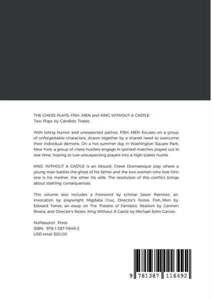 THE CHESS PLAYS: FISH...MEN and KING WITHOUT A CASTLE by Cándido Tirado. About the two plays in this collection: With biting humor and unexpected pathos, FISH MEN Men focuses on a group of unforgettable characters, drawn together by a shared need to overcome their individual demons. KING WITHOUT A CASTLE is an Absurd, Greek Dramaesque play where a young man battles the ghost of his father and the two women who love him: one is his mother, the other his wife. The resolution of this conflict brings about startling consequences. These two plays are a welcome addition to the growing and thrilling body of performance literature by US Latine playwrights. This book is from NoPassport Press.
